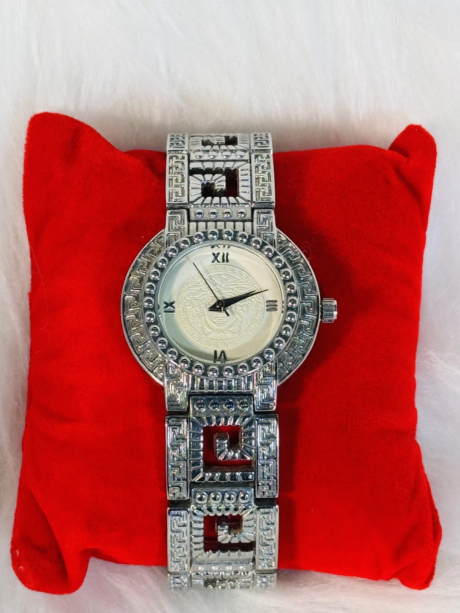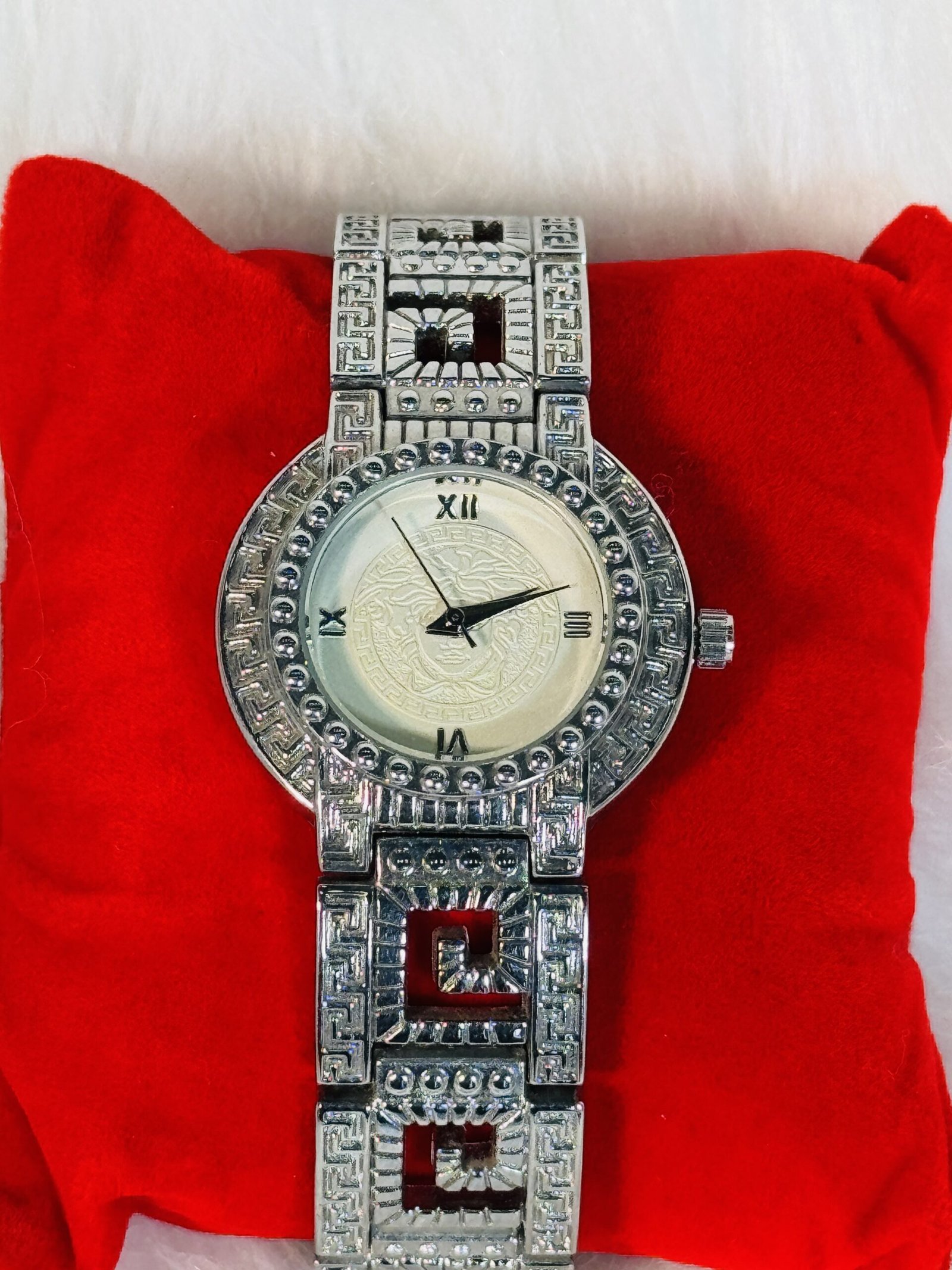 Every aspect of the Versace wristwatch has been designed to captivate. Its cream-colored screen provides a subtle yet striking contrast to the silver strap, making it truly eye-catching. The engraved silver sides add an extra layer of refinement, showcasing the dedication to detail that Versace is known for. Functional yet stylish rotation hands enhance readability while maintaining the watch’s sleek design.