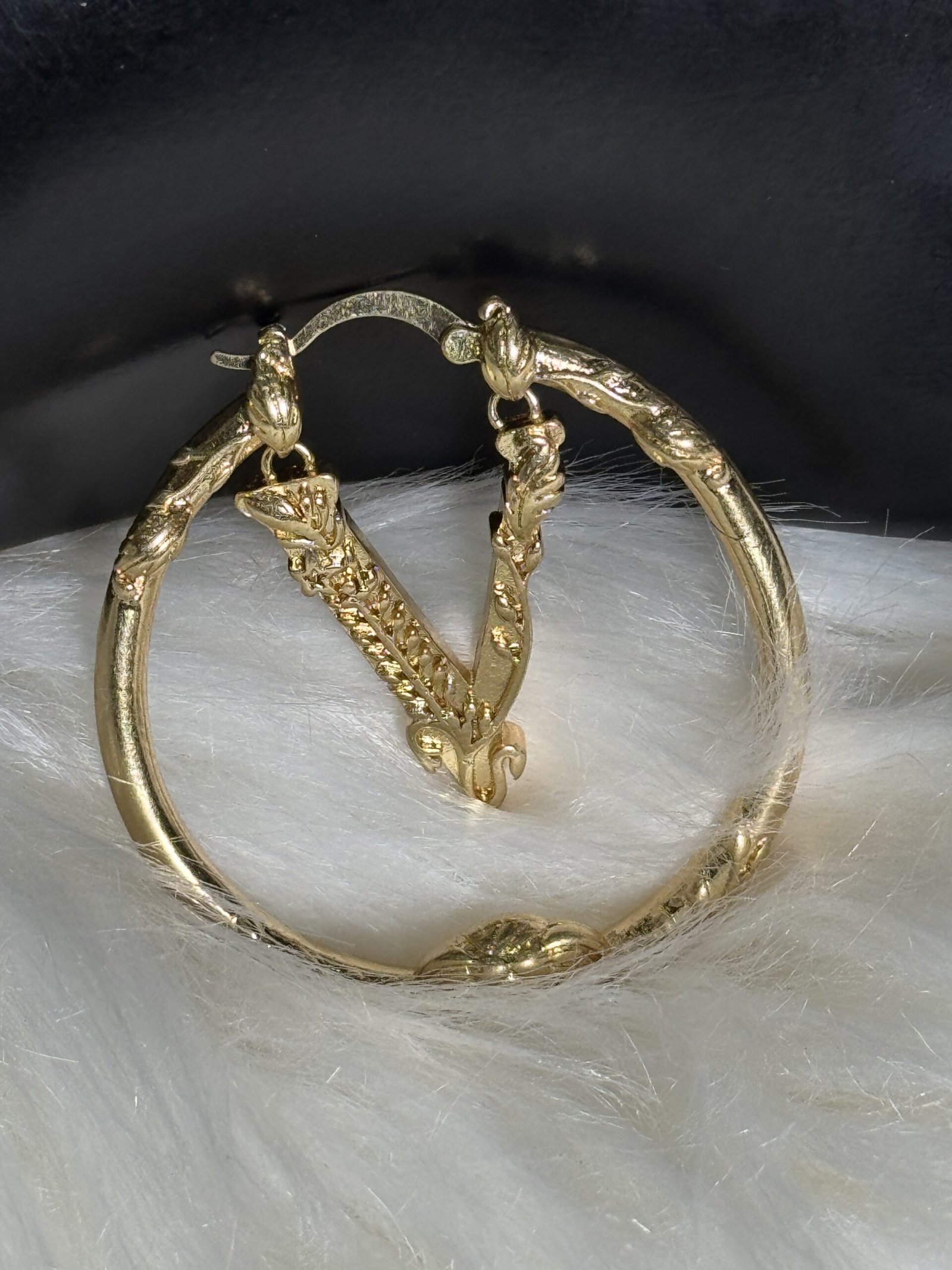 Crafted with precision, the ‘V’ structure of these big loop earrings showcases Versace’s iconic design language. The dazzling golden hue accentuates their bold yet elegant appeal, creating a piece that’s both refined and attention-grabbing. Their lightweight composition ensures long-lasting comfort, allowing you to enjoy wearing them day or night without compromising on ease or style.