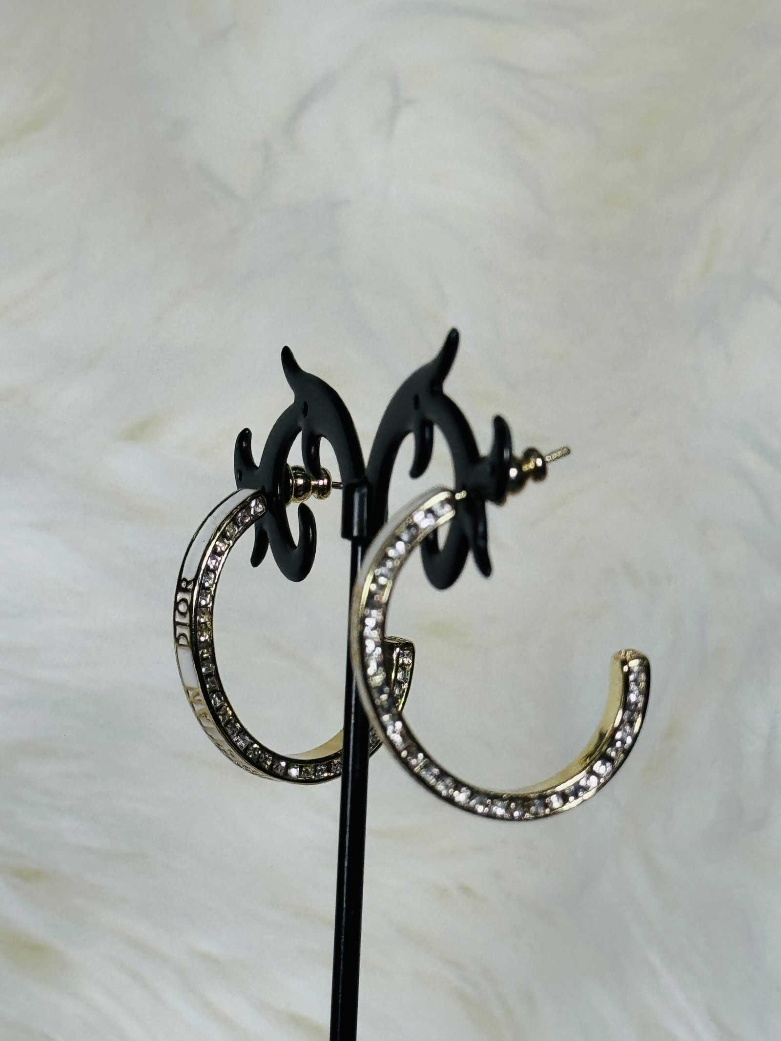 Crafted with precision and care, these earrings are designed to provide both comfort and elegance. The white half loop structure strikes a delicate balance between minimalism and boldness, while the golden “Christian Dior” prints add a touch of high-fashion flair. Perfectly sized for versatility, they frame your face beautifully without being overpowering, making them ideal for daily wear or special occasions.